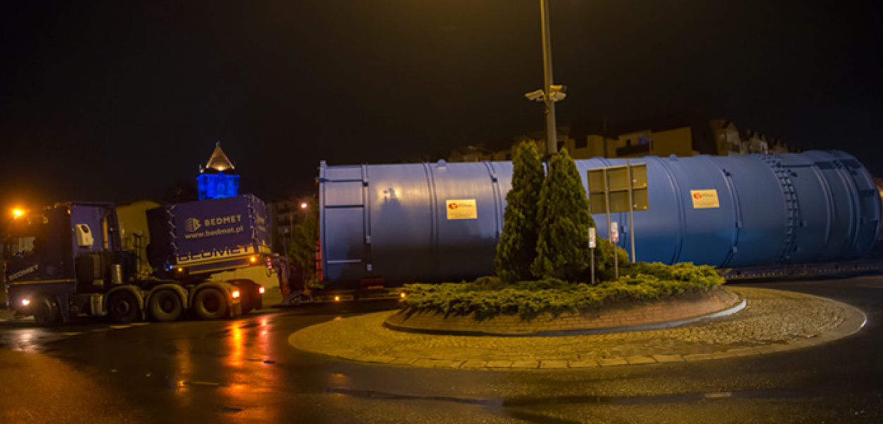 Na czas przejazdu dwóch 35-metrowych załadunków konieczne było zamknięcie całego odcinka drogi, bo pojazdy nie mieściły się na jednym pasie ruchu. Transport eskortowały dwa auta pilotowe. Najtrudniejszy był sam wyjazd z siedziby firmy Instal-Filter, a następnie przejazd przez "krzywe rondo". Przed wjazdem na nie, zdemontowano plastikowe słupki na wysepkach, by nie uległy zniszczeniu.