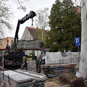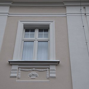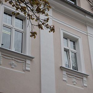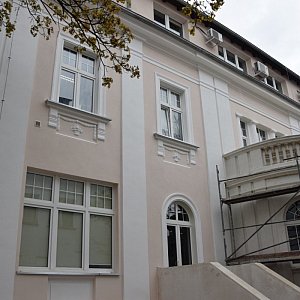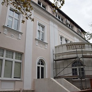 Zdemontowane rusztowanie przy bocznej ścianie budynku pozwala dostrzec pierwsze efekty prac. Teraz budynek będzie w kolorze kremowym. Zwracają uwagę detale architektoniczne, które przed remontem trudno było dostrzec. Rusztowania są przenoszone na inne miejsca prac.