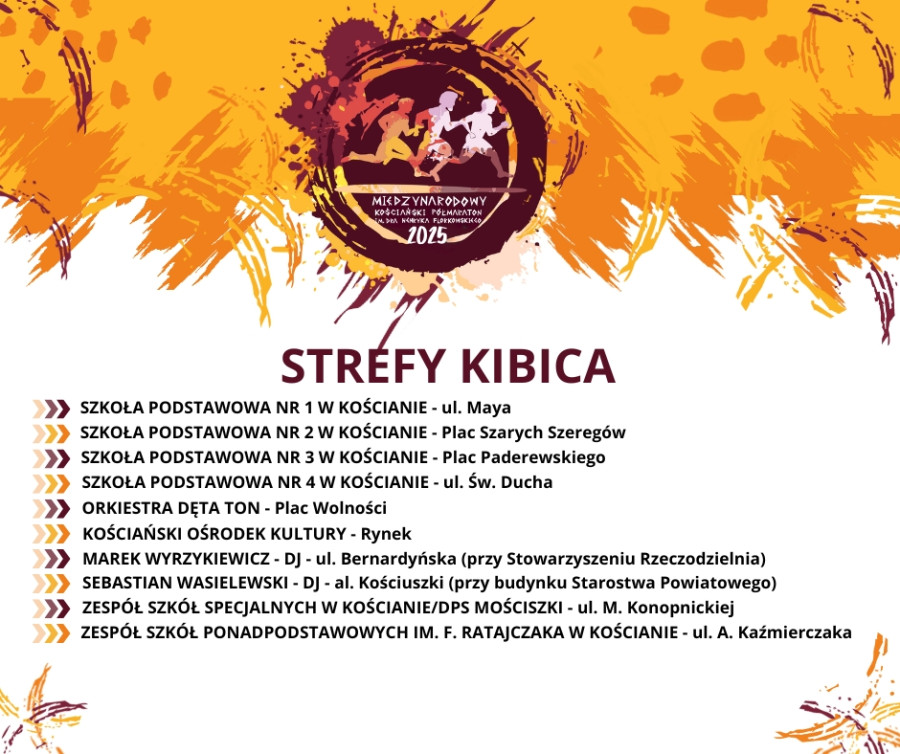 Strefy kibica oraz artystyczne będą działać w czasie trwania biegu. Centralna strefa kibica znajdzie się na Rynku, a poprowadzi ją Kościański Ośrodek Kultury. Po godzinie 12.00 na scenie na Rynku rozpoczną się występy z tańcem w roli głównej. Wystąpią dziecięce i młodzieżowe grupy taneczne, a także dorosłych, w tym: Street Beat, Szkoła tańca Poezja, ArtDance Zumba.