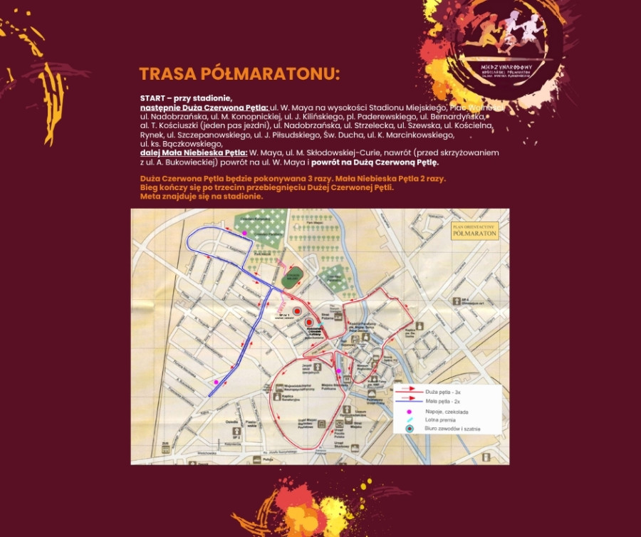 Trasa biegu będzie przebiegać Dużą Czerwoną Pętlą, którą zawodnicy będą przebiegać 3 razy oraz Małą Niebieską Pętlą, którą pokonają 2 razy (grafika poniżej).