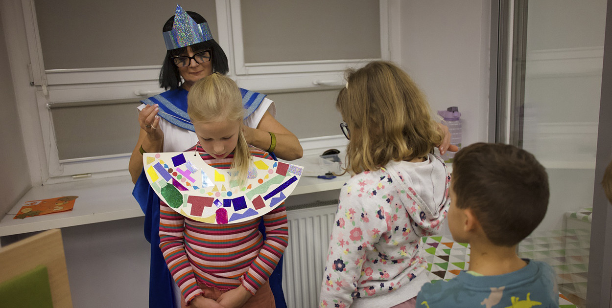 Przez kilka godzin najgłośniej i najbardziej wesoło było tradycyjnie w mieszczącym się na samej górze budynku dziale dziecięcym. Tym razem panie bibliotekarki z tego działu zaprosiły najmłodszych na „Egipską Noc”. Cały wystrój, jak i stroje, nawiązywały do starożytnego Egiptu, a także zadania, które czekały na najmłodszych. Niezwykle dużo emocji dostarczył quiz „Rozszyfruj Egipt”, w którego rozwiązywanie wciągały się całe rodziny, a którego poszczególne zadania rozsiane były po całej bibliotece. Po rozwiązaniu każdej z zagadek uczestnicy otrzymywali naklejkę, a na koniec nagrodę niespodziankę. W oddziale dziecięcym odbywały się ponadto warsztaty artystyczne na „Egipskie ozdoby”. Dzieci rysowały i kleiły. Umożliwiono im nawet wypróbowanie egipskiego piasku tworząc mini piaskownicę. Po tych emocjach uczestnicy warsztatów mogli obejrzeć film familijny „Mój brat ściga dinozaury” wyświetlany w sali na samym dole.