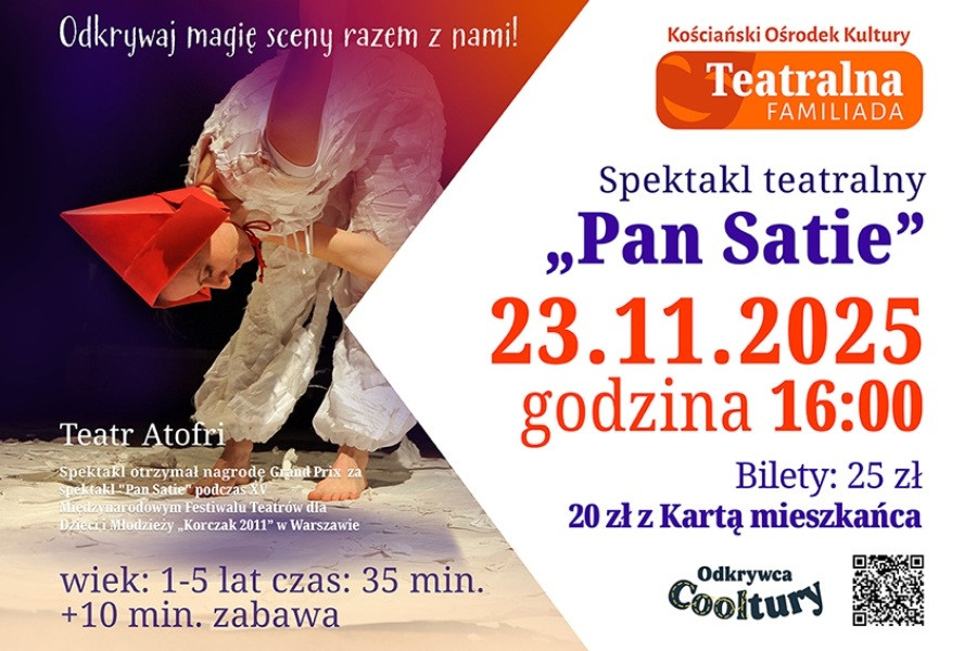 Przed nami drugie spotkanie z Teatrem Atofri specjalizującym się w spektaklach dla najmłodszych. Już w najbliższą niedzielę, 23 listopada zostanie pokazany spektakl „Pan Satie”, dla dzieci w wieku 1-5 lat.