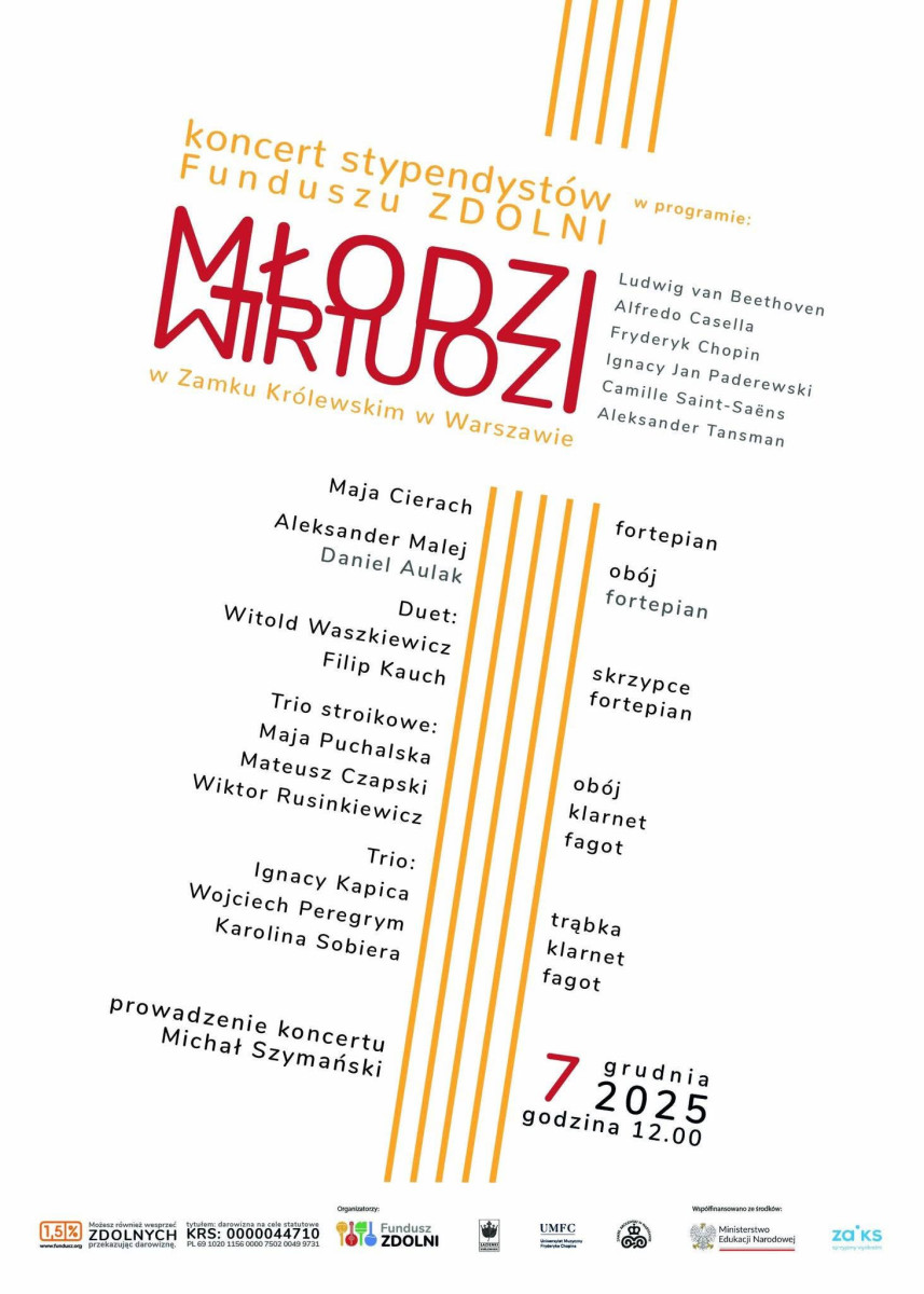 Pierwszy z koncertów już w niedzielę, 7 grudnia, o godz. 12.00. To koncert stypendystów Funduszu Zdolni Młodzi Wirtuozi. Odbędzie się on na Zamku Królewskim w Warszawie. Filip Kauch zdradza, że razem z Witoldem Waszkiewiczem wykonają „Sonatę na fortepian i skrzypce a-moll op. 13” Ignacego Jana Paderewskiego. Ponadto na tym koncercie wystąpią także inni młodzi zdolni, którzy zagrają na różnych instrumentach w tym na fortepianie, oboju, skrzypcach, klarnecie, fagocie i trąbce.