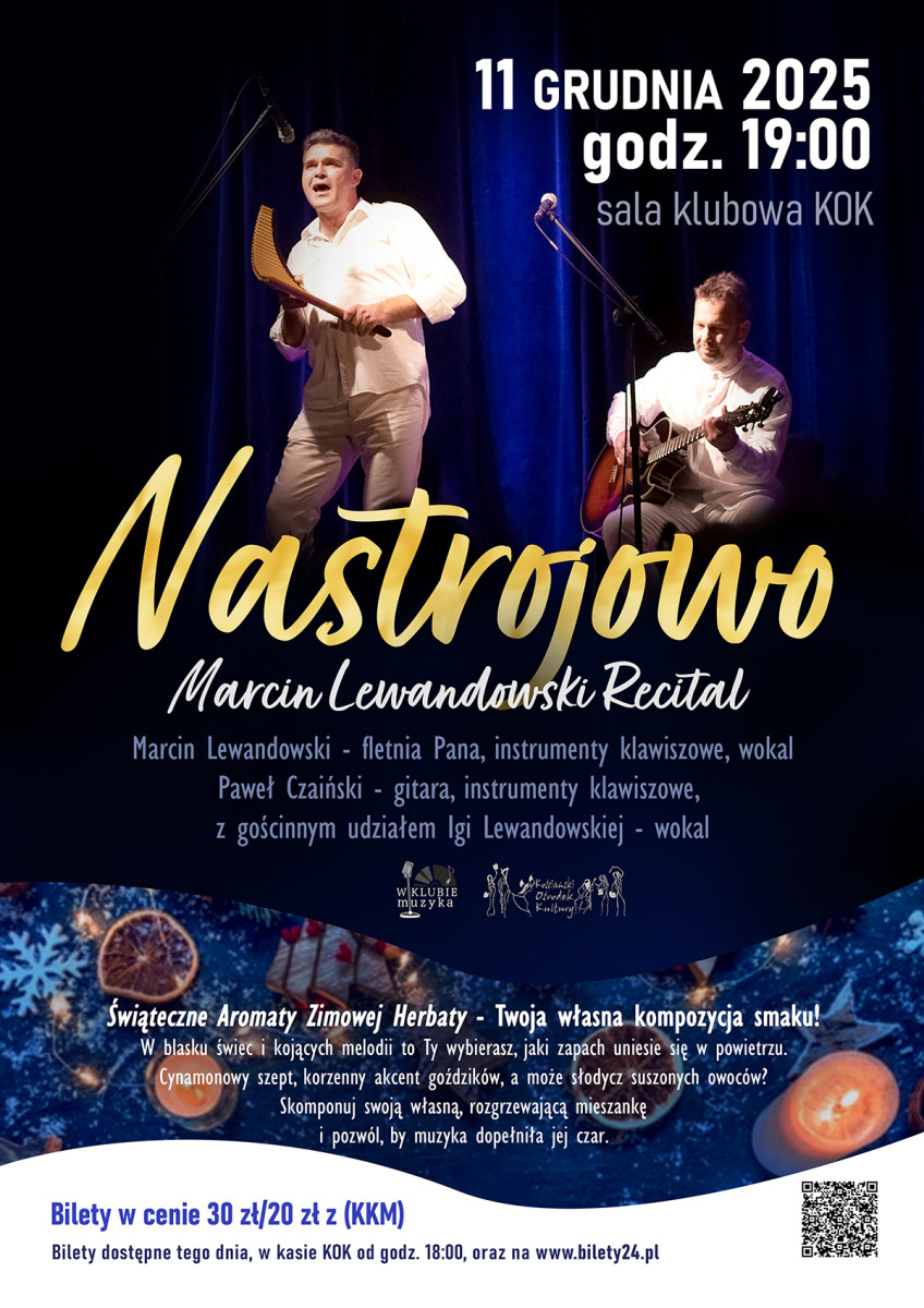 W warstwie muzycznej to spotkanie wypełnią instrumenty, wyjątkowe głosy i emocje, które zostają w pamięci na długo po ostatnim akordzie. Artysta Marcin Lewandowski to pasjonat, samouk, multiinstrumentalista, który od lat przemierza muzyczne ścieżki fletni. Łączy tradycję z nowoczesnością, a z tej mieszanki rodzą się dźwięki, które trudno pomylić z czymkolwiek innym.
