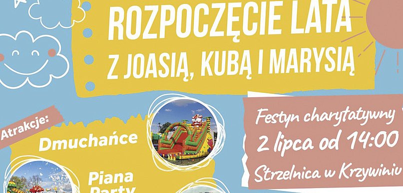 W niedzielę, 2 lipca na Strzelnicy w Krzywiniu odbędzie się impreza pod nazwą "Rozpoczęcie lata z Joasią, Kubą i Marysią". Podczas zabawy będzie przeprowadzana zbiórka pieniędzy dla trójki dzieci.