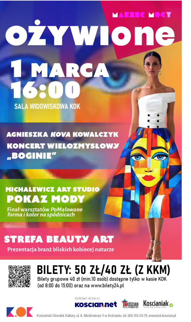 „Ożywione” to także pokaz mody Ewy Michalewicz. To kościańska artystka, która wspólnie z mężem tworzy Michalewicz Art Studio malując, prowadząc ciekawe warsztaty i angażując się w wiele projektów zmieniających kościańską przestrzeń. Podczas tego wieczoru modelki zaprezentują spódnice stworzone podczas styczniowych warsztatów artystycznych z cyklu PoMalowane. Każda z nich jest unikatową formą ekspresji — zapisem emocji, osobistych historii i kobiecej kreatywności przeniesionej na tkaninę.