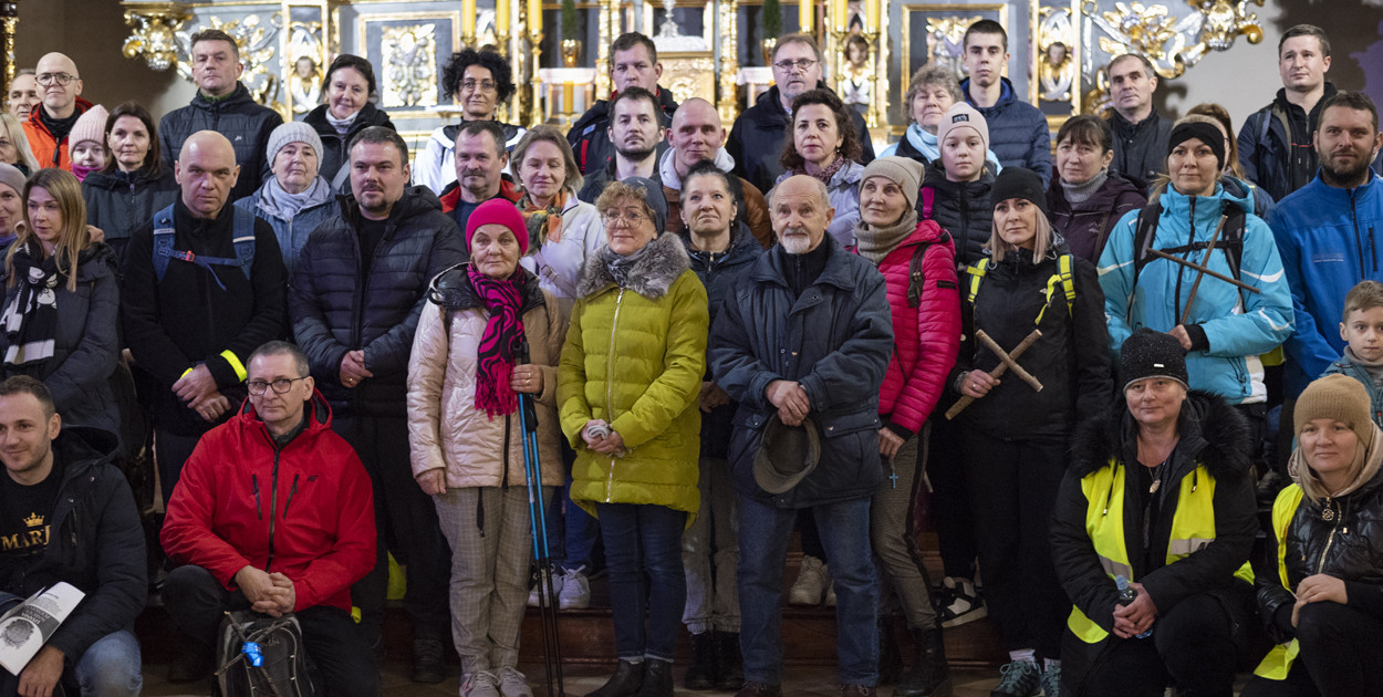 Potem nastąpiło wyjście pod kościół. Wielu uczestników drogi miało ze sobą drewniane krzyże. W końcu wyruszyli w trasę z dużym krzyżem na czele. Tempo było bardzo szybkie. Do pokonania mieli na początek około 12 kilometrów do kościoła pw. Św. Andrzeja Apostoła, w którym znajduje się obraz Andrzeja Boboli. Trasa wiodła wzdłuż kanału Obry, nieutwardzoną drogą i ścieżką pieszo-rowerową. Co istotne, była w większości sucha. Dopisała także pogoda, bo noc była raczej ciepła, choć akurat gdy pielgrzymi wyruszyli w drogę, rozpadało się na moment.