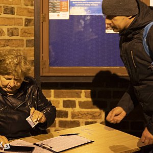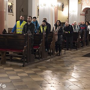 Uczestnicy Nocnej Drogi Krzyżowej zgromadzili się w kościele farnym o godzinie 19.00. Zapisanych na uczestnictwo w wydarzeniu było około 40 osób, ale pod kościołem chęć uczestnictwa zadeklarowało kolejnych 40 osób. Łącznie uczestników było zatem około 80. W kościele odbyło się wspólne nabożeństwo. Po jego zakończeniu przyszedł czas na wspólną fotografię przy ołtarzu oraz przekazanie informacji organizacyjnych.