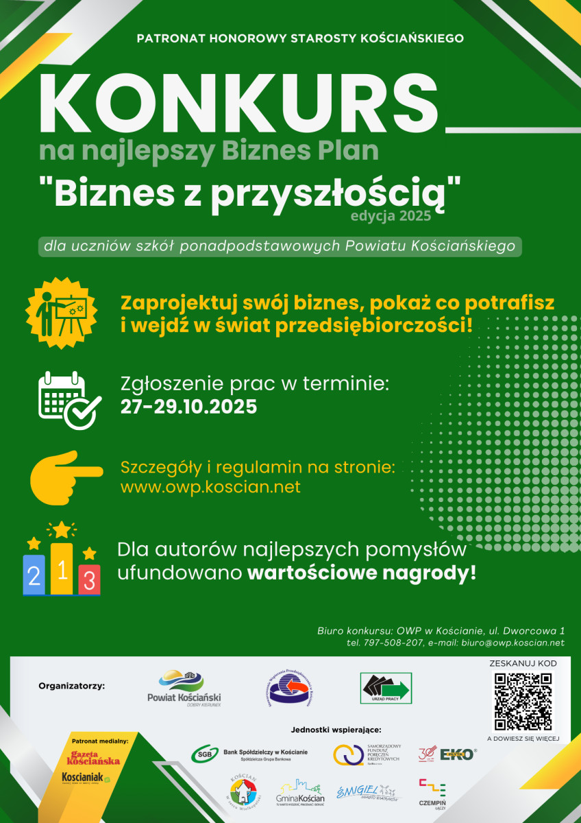 Wszelkie informacje dotyczące konkursu, a także regulamin i niezbędne formularze znajdują się na stronie internetowej OWP w Kościanie: https://owp.koscian.net/Konkurs_Biznes_z_przyszloscia_2025.html
