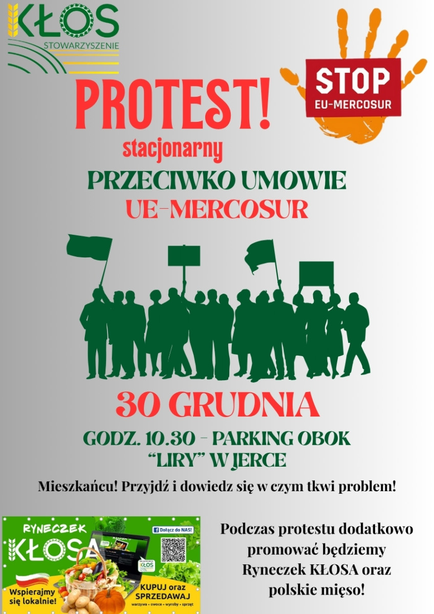 - 30 grudnia wychodzimy na ulice, aby sprzeciwić się umowie UE–Mercosur. Żądamy, by rząd RP stanął po stronie polskich rolników i polskich obywateli, a nie taniego importu kosztem naszego bezpieczeństwa żywnościowego – taką informację zamieszczono na profilu Oddolnego Ogólnopolskiego Protestu Rolników.