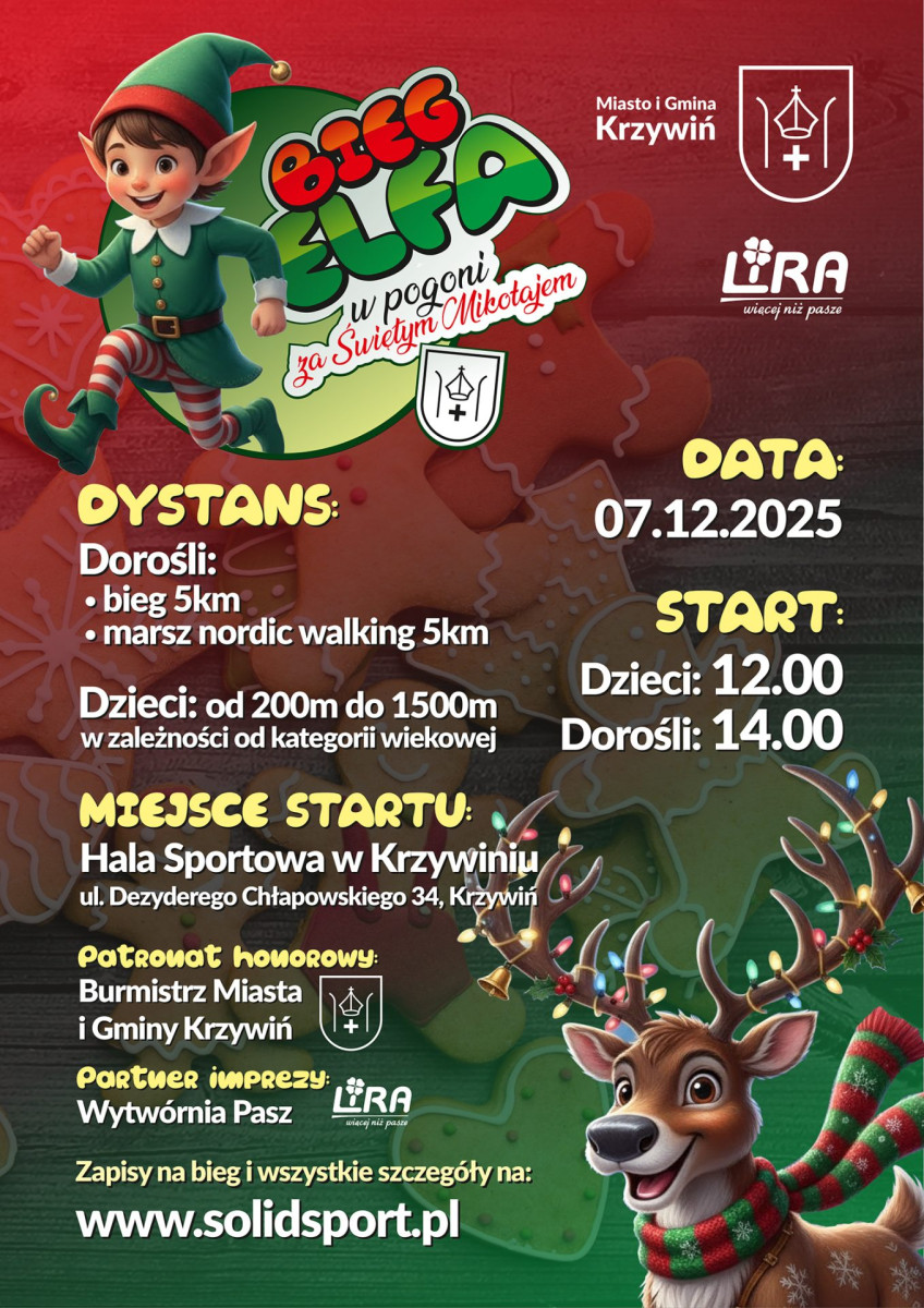 O godz. 14.00 wystartuje natomiast bieg główny i marsz nordic walking. Obie konkurencje będą na 5 km. Dla wszystkich, którzy zapiszą się i opłacą bieg do 30 listopada, gwarantowany jest pamiątkowy medal oraz catering. Szczegóły dotyczące zapisów i regulaminy na: https://solidsport.pl/solid-run/solid-run-bieg-elfa/.