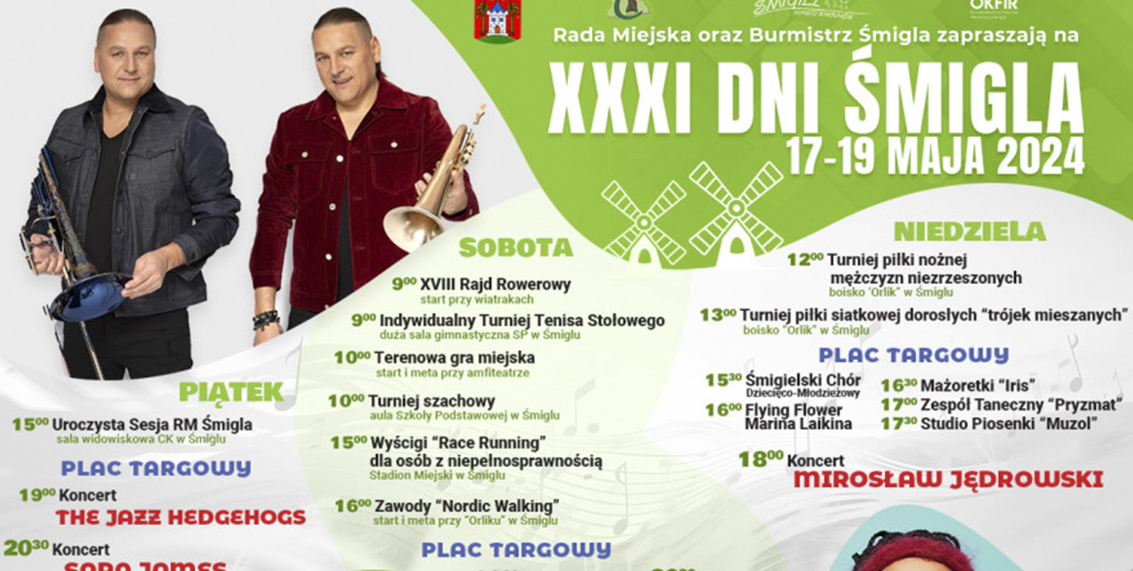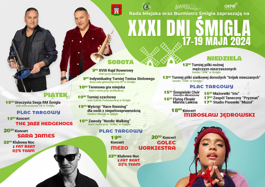 Sobota zacznie się sportowo od samego rana. O godz. 9.00 wyruszy Rajd Rowerowy spod wiatraków. W tym samym czasie rozgrywany będzie Indywidualny Turniej Tenisa Stołowego na Sali gimnastycznej w Szkole Podstawowej w Śmiglu. Ponadto w szkole odbędzie się również Turniej szachowy. O godz. 10.00 rozpocznie się Terenowa gra miejska, a jej początek przy amfiteatrze. Po południu wyścigi Race Running dla osób z niepełnosprawnościami, a następnie zawody Nordic Walking, które wystartują przy Orliku.