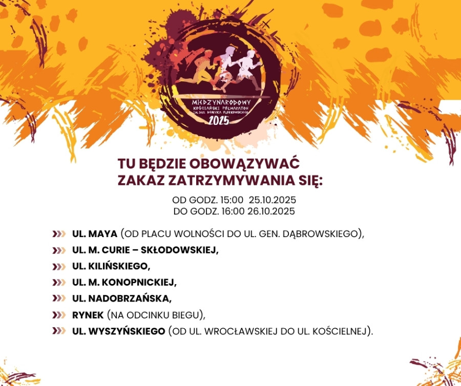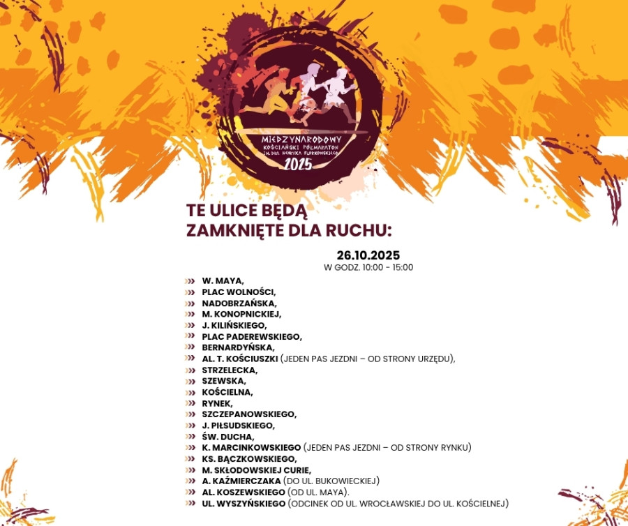 Podczas półmaratonu w niedzielę, 26 października, część ulic będzie nieprzejezdna. Ponadto na części ulic będzie obowiązywał zakaz zatrzymywania się już od soboty, 25 października, od godz. 15.00. Organizatorzy przepraszają za utrudnienia i jednocześnie zachęcają do kibicowania. Atrakcji będzie bowiem sporo. (zobacz: Kościański Półmaraton. Moc atrakcji dla kibiców