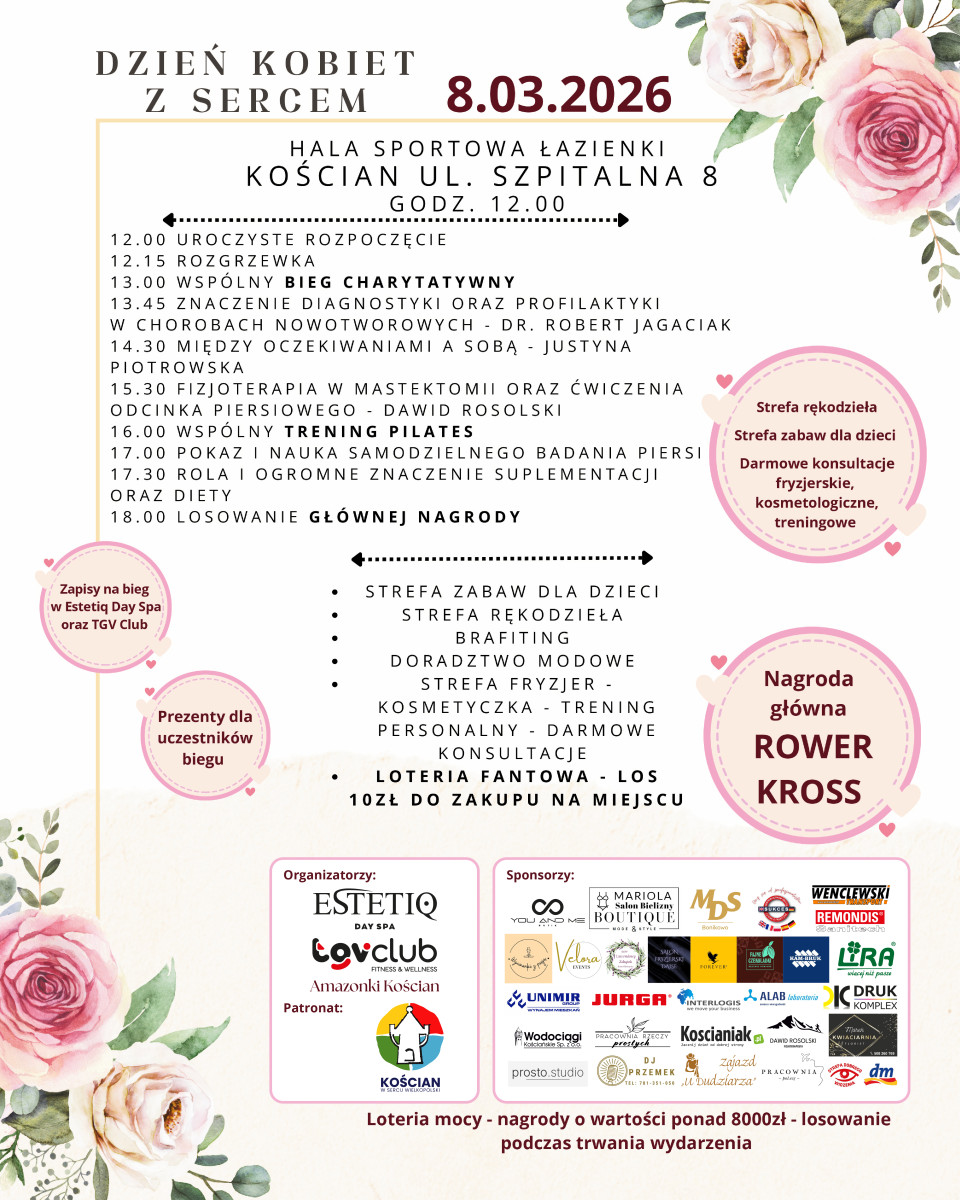 „Dzień Kobiet z sercem” rozpocznie się w samo południe od uroczystego otwarcia. Potem przewidziany jest bieg ze wspólną rozgrzewką, a o godz. 16.00 wspólny pilates. Przez cały czas trwania wydarzenia dostępne będą stoiska, a o określonych godzinach odbywać będą się wykłady. Szczegółowy plan godzinowy znajduje się na plakacie poniżej. Intensywny dzień zakończy losowanie nagród o godz. 18.00.