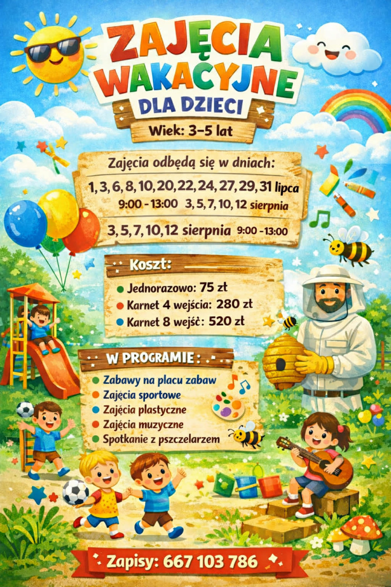 W najbliższe wakacje Zakątek Dziecięcej Radości organizuje dla dzieci w wieku 3-5 lat stacjonarne zajęcia wakacyjne. Podczas tych spotkań będą odbywać się zajęcia sportowe, plastyczne i muzyczne, a także na placu zabaw. Milusińscy spotkają się także z pszczelarzem.