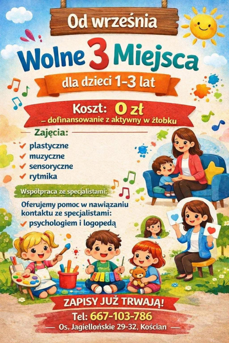 Od września zwalniają się 3 miejsca dla dzieci w wieku 1-3 lat.